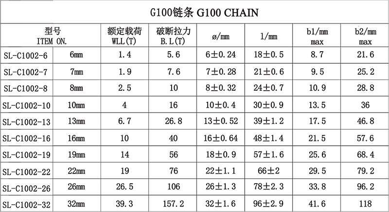 1、EN818-2标准起重链条。 2、在2.5倍工作拉力下进行验证测试。 3、破断拉力试工作拉力的4倍。 4、性能比80级链条提升25%。